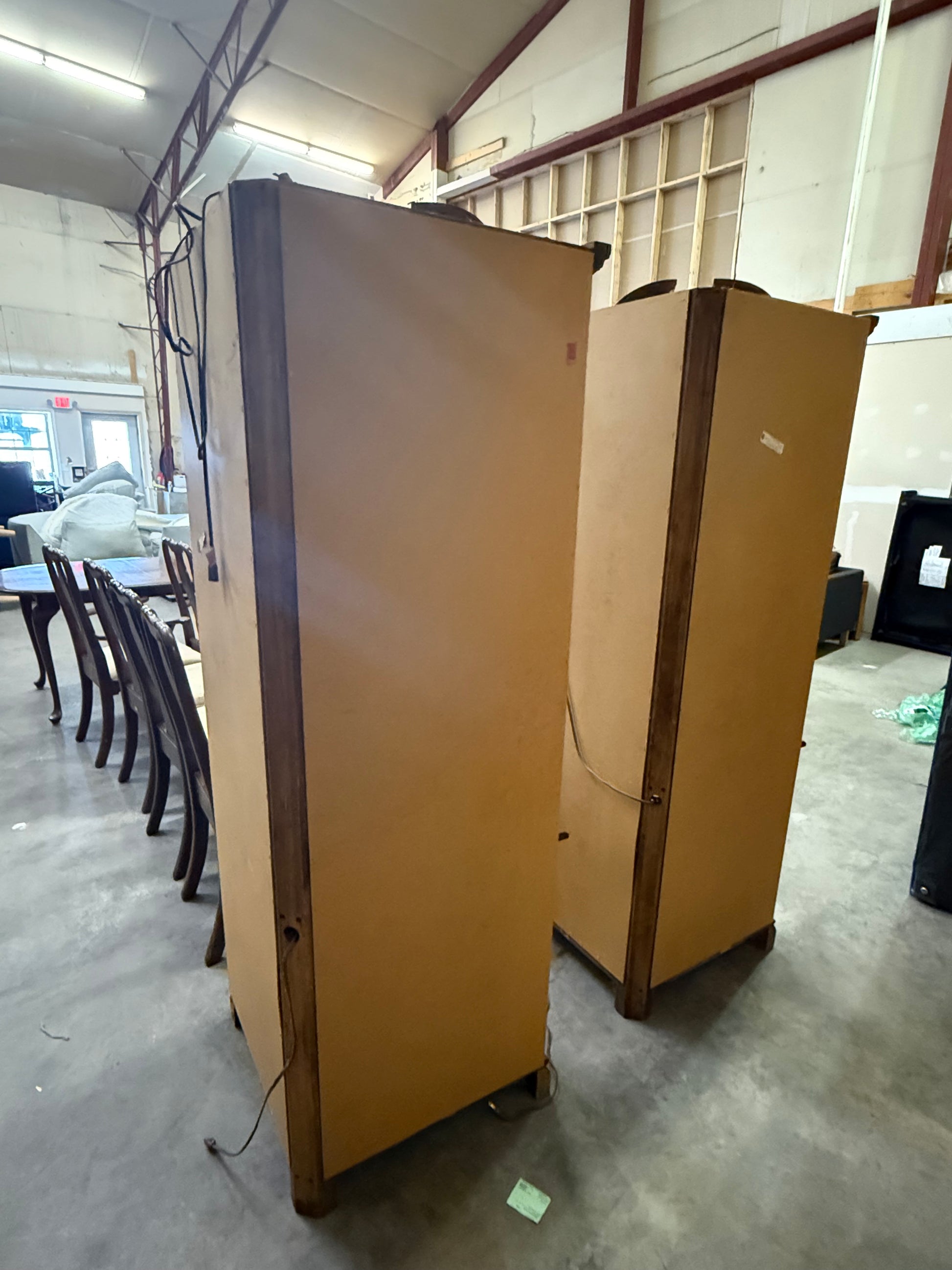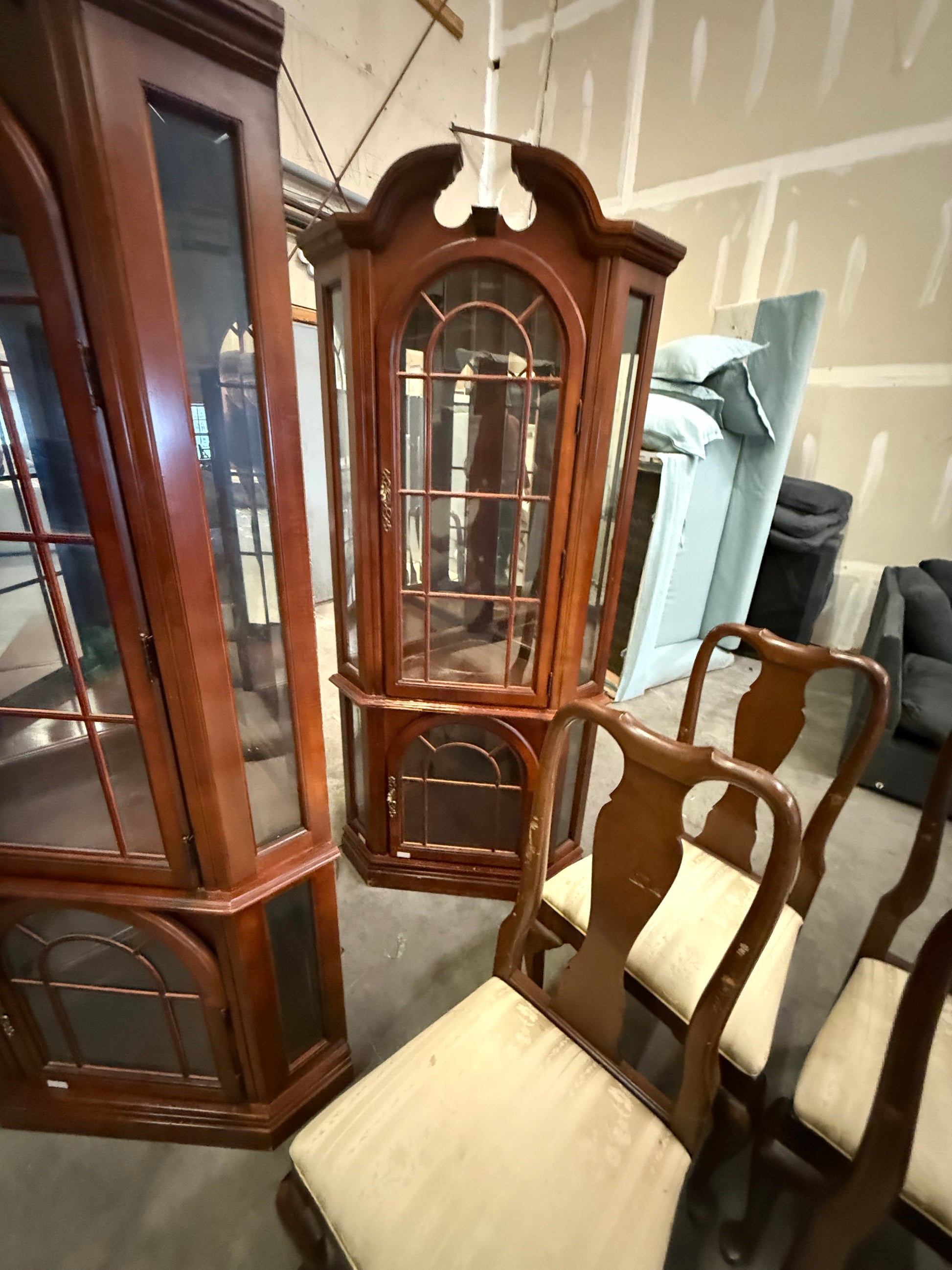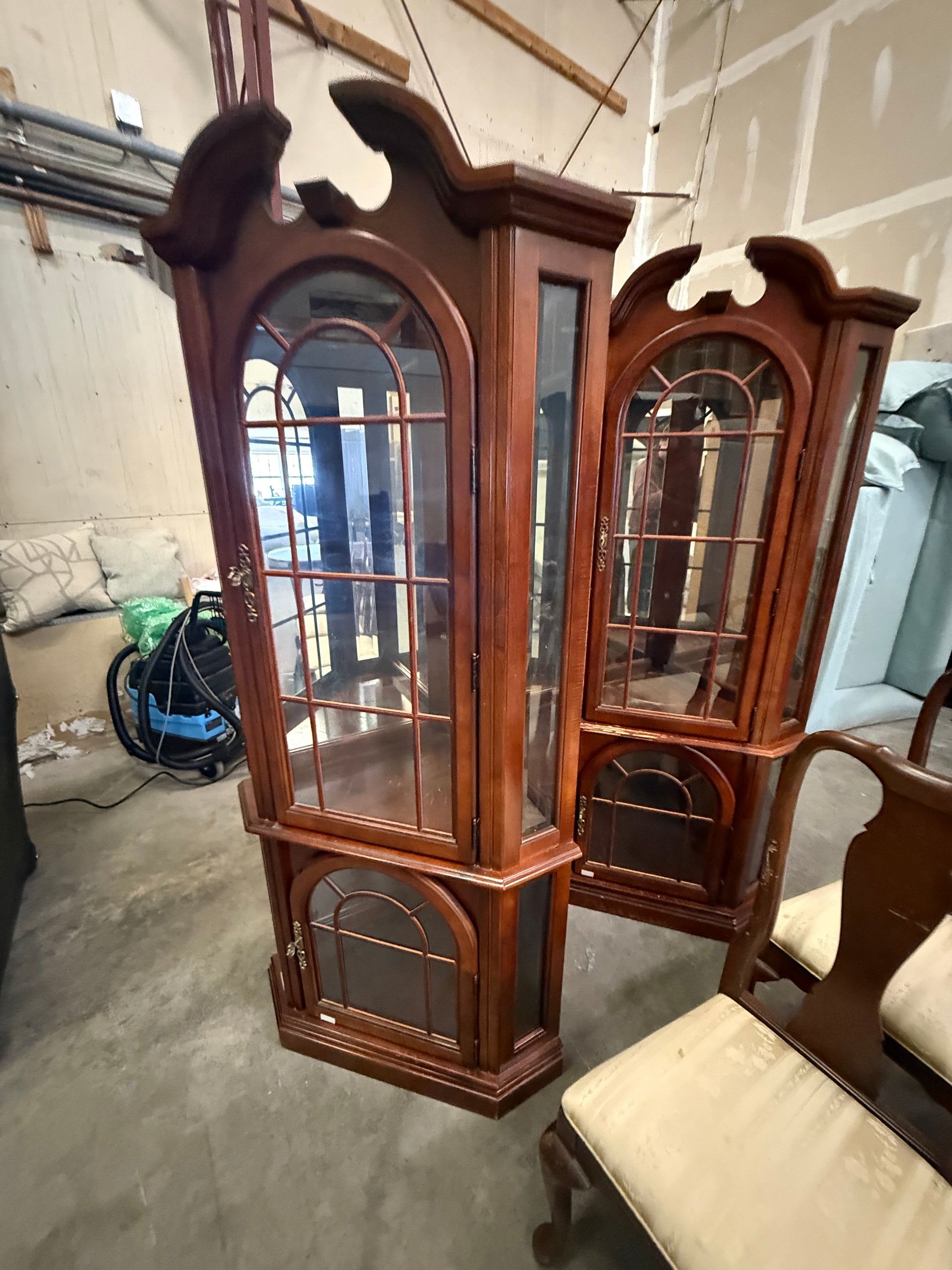 -good condition overall, includes small points that arent in photo, cherry wood, matcing set, glass shelves, working lights, each has two functioning cabinet doors. I listed a matching Ethan Allen diningroom table set as well.Â