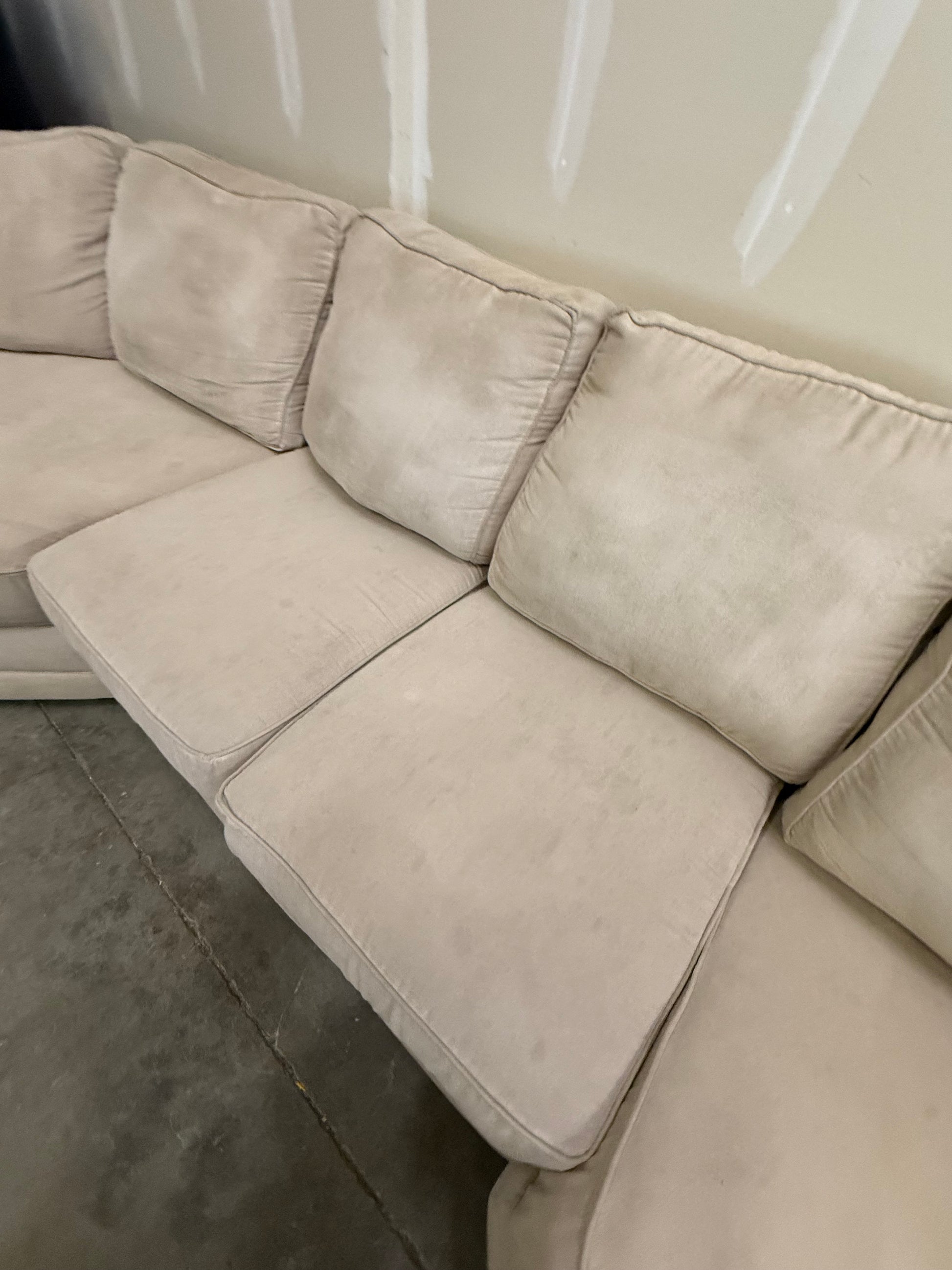 This couch is in great shape and is 160 inches from side to side. It is a beige color which shows use more than other colors. The cushions have been cleaned and it is from a very clean home. It comes in three pieces. Expect mild signs of use and faint signs of color due to light beige color.