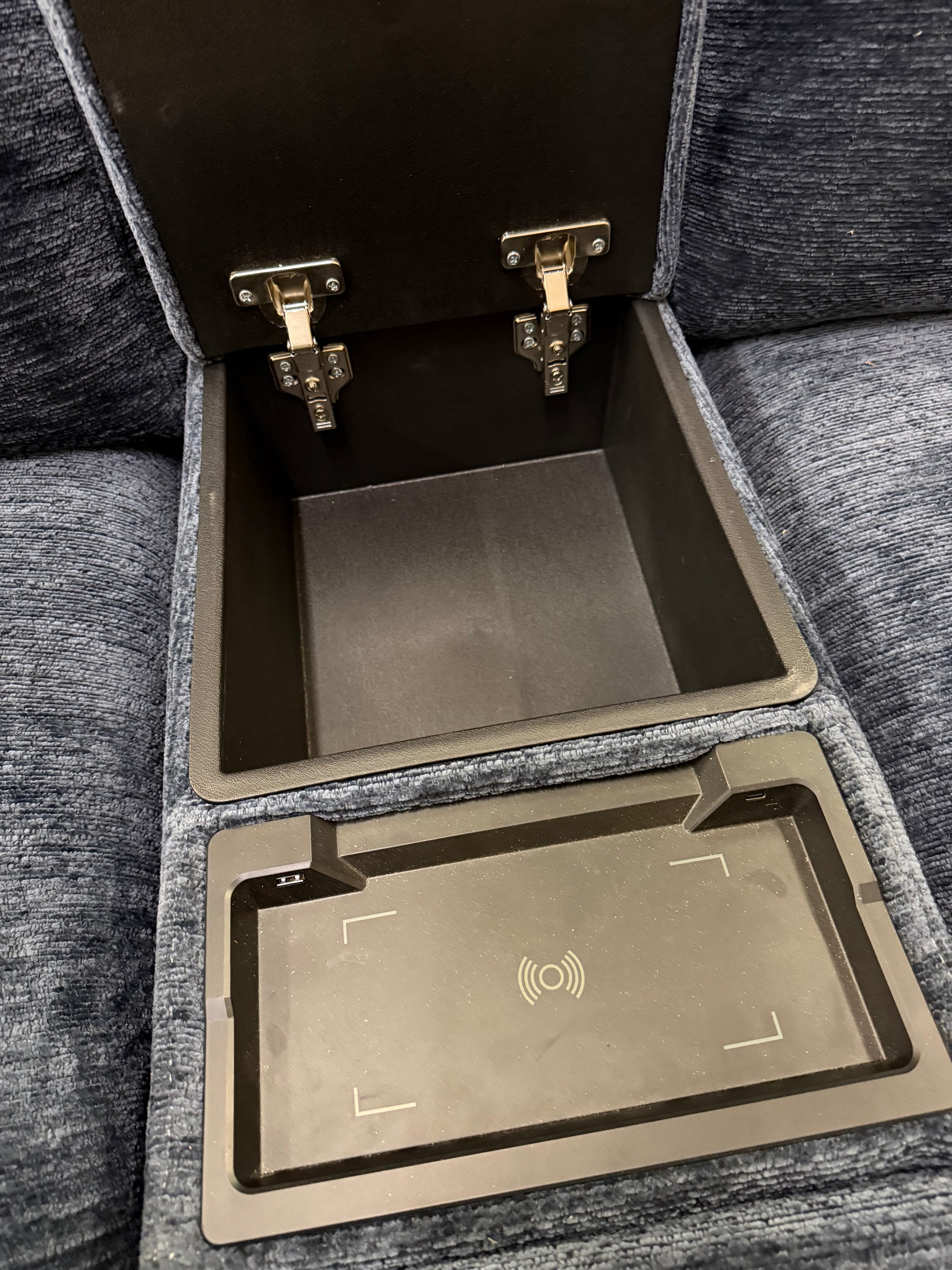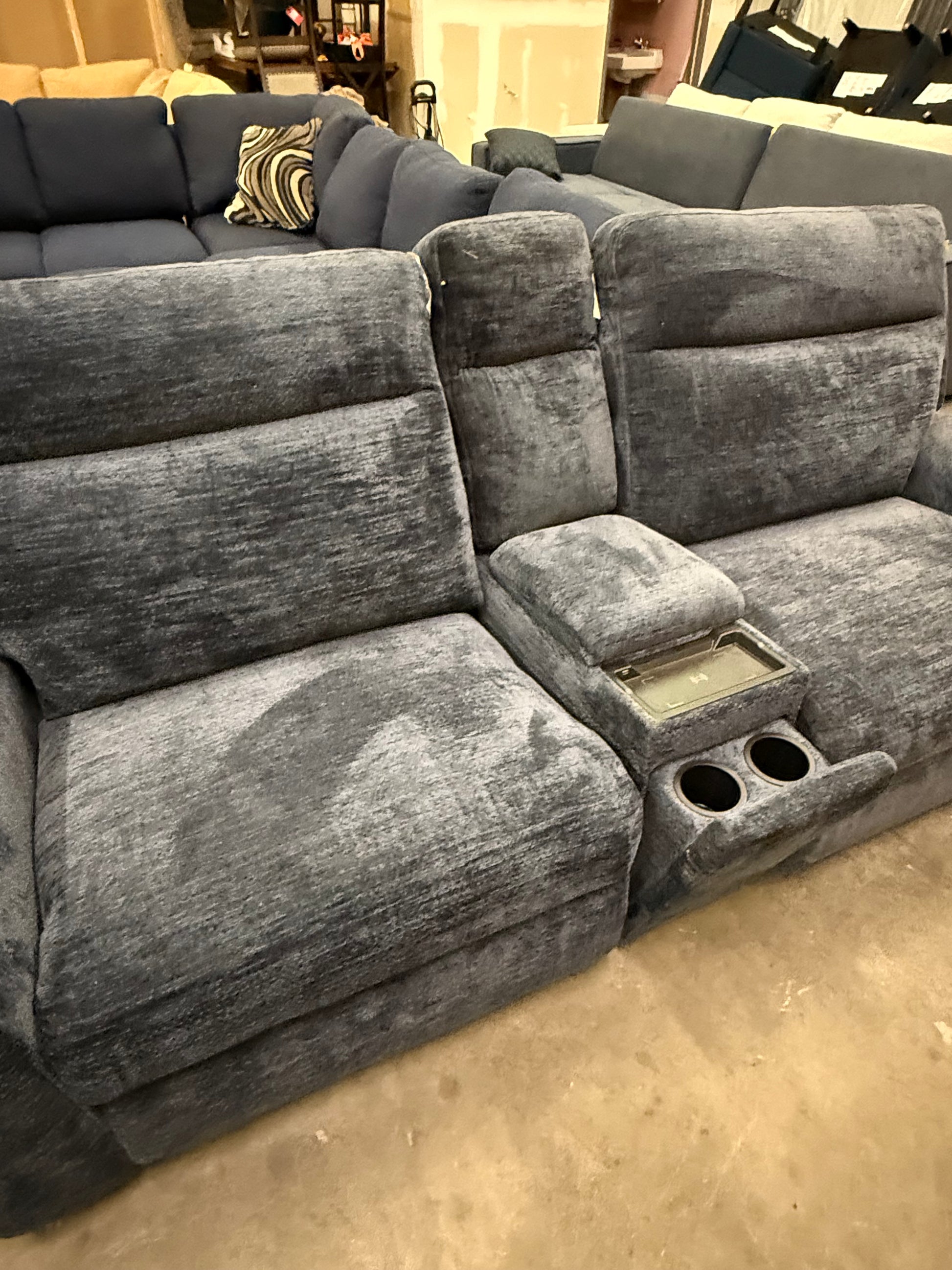 This couch is a like-new/open box model that was either a display model or returned quickly after purchase. The couch is in like-new condition and shows no signs of prior use. It measures 90 inches wide and has usb chargers on both sides with power recliners. The center console has usb chargers and a wireless charging pad.