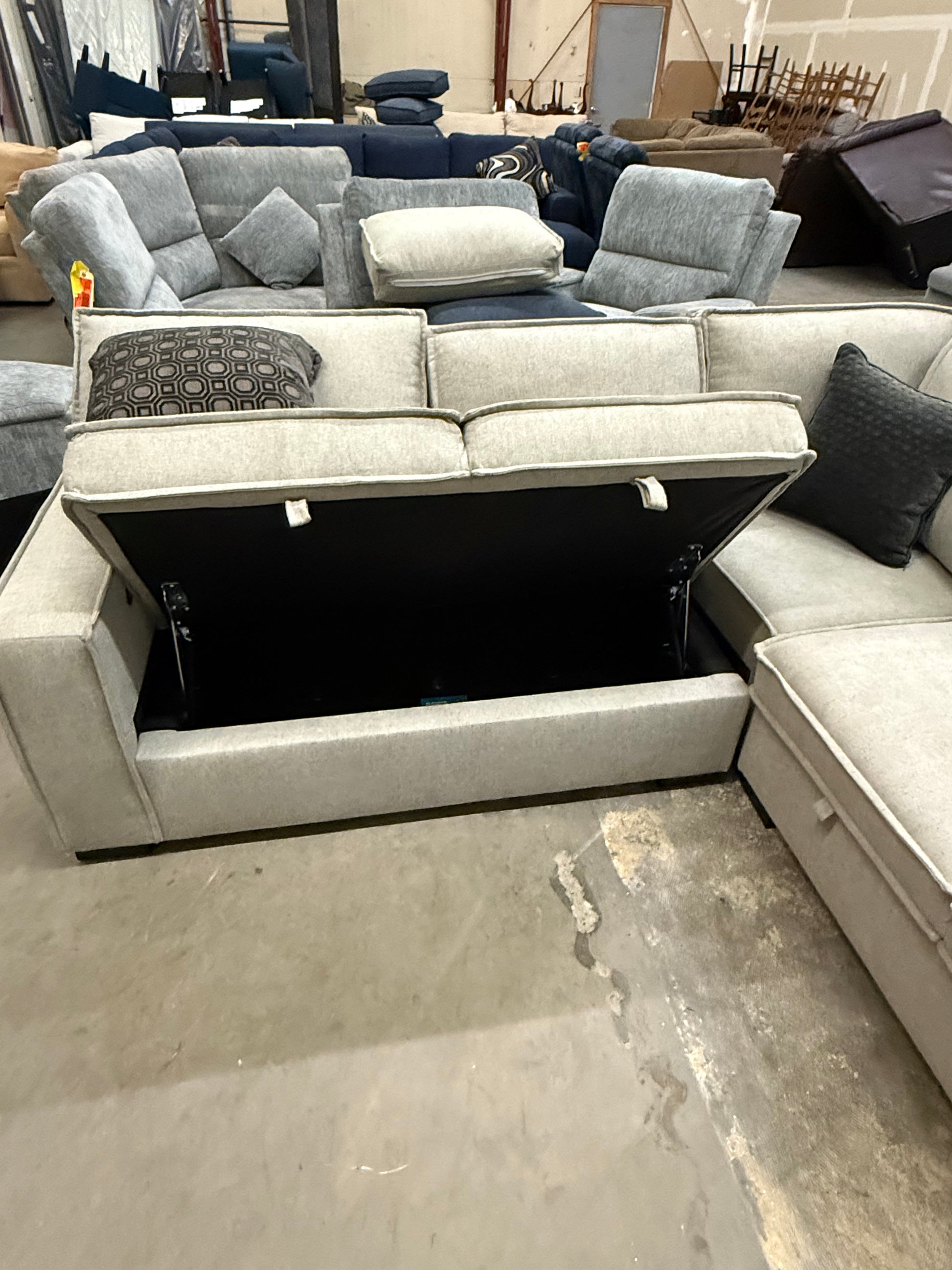 This couch is a like-new/open box model that was either a display model or returned quickly after purchase. This couch has storage and the far right chaise has a different back style and is a very similar hue of gray to the other three pieces with storage. The chaise piece also has a small 2 inch rip in the back top of the fabric that is out of view. The left side and middle pieces have storage. Make sure you see the last two photos that show the chaise back compared to the others and the slightly different hue. It measures 90x125x70.