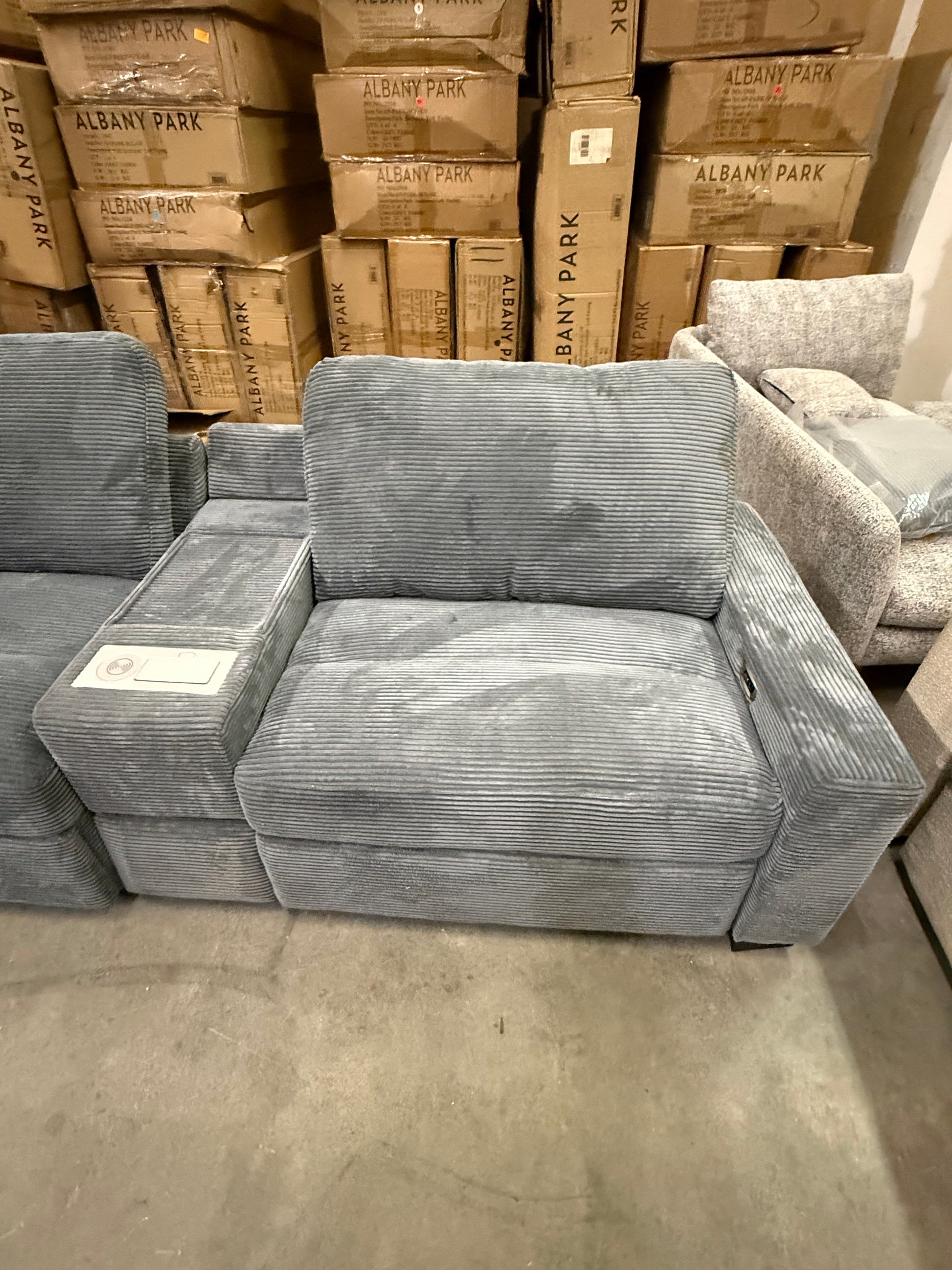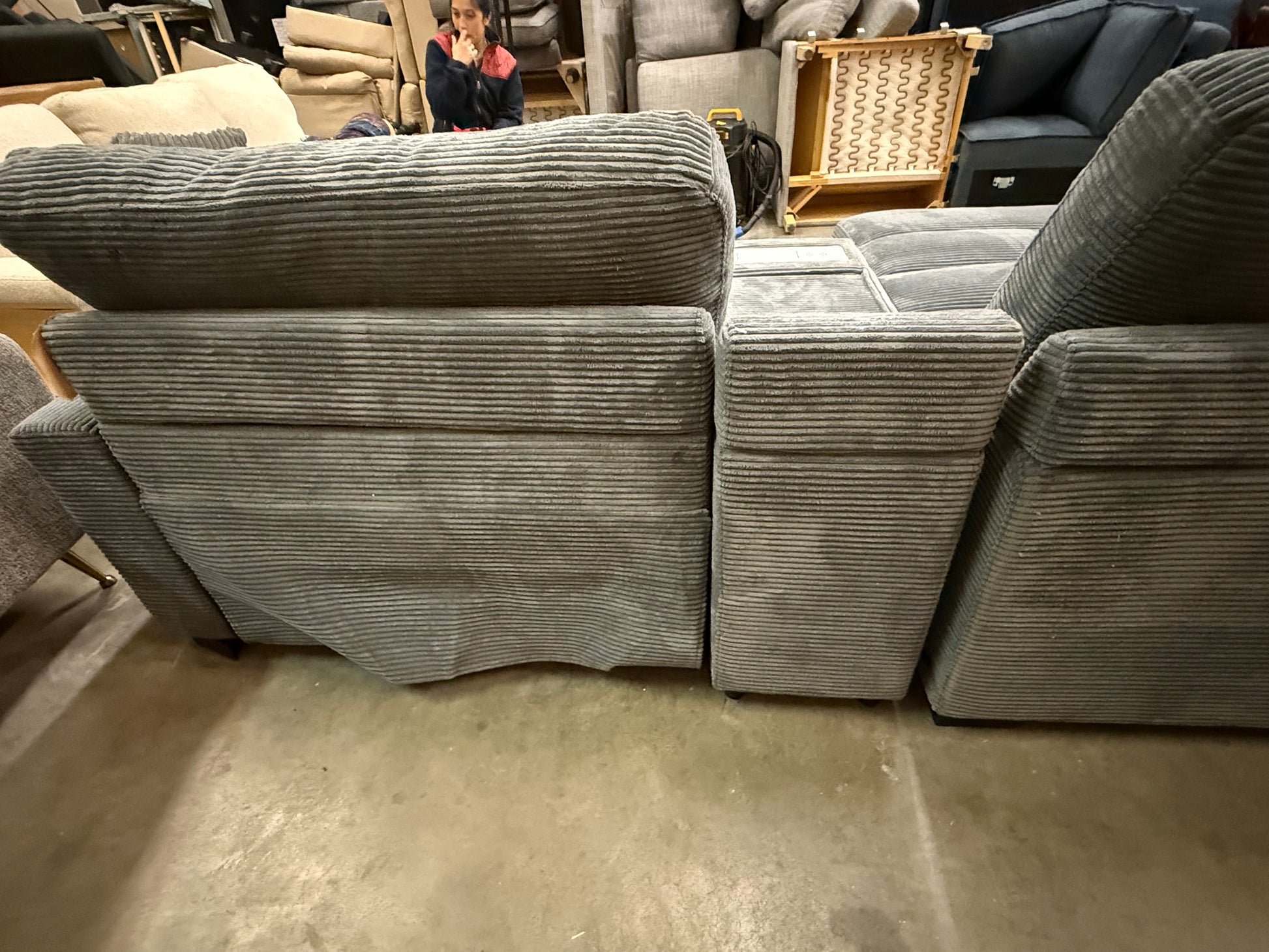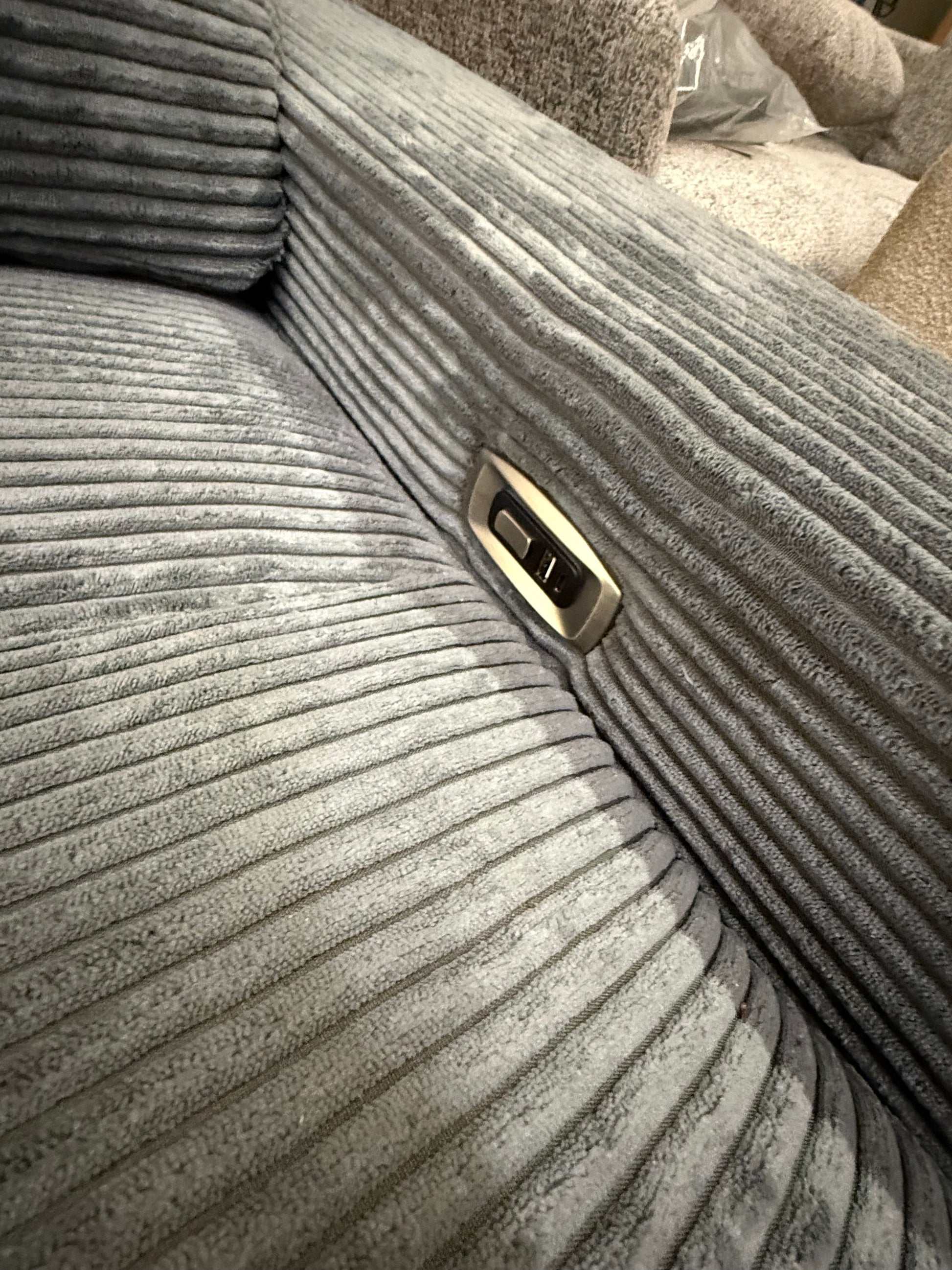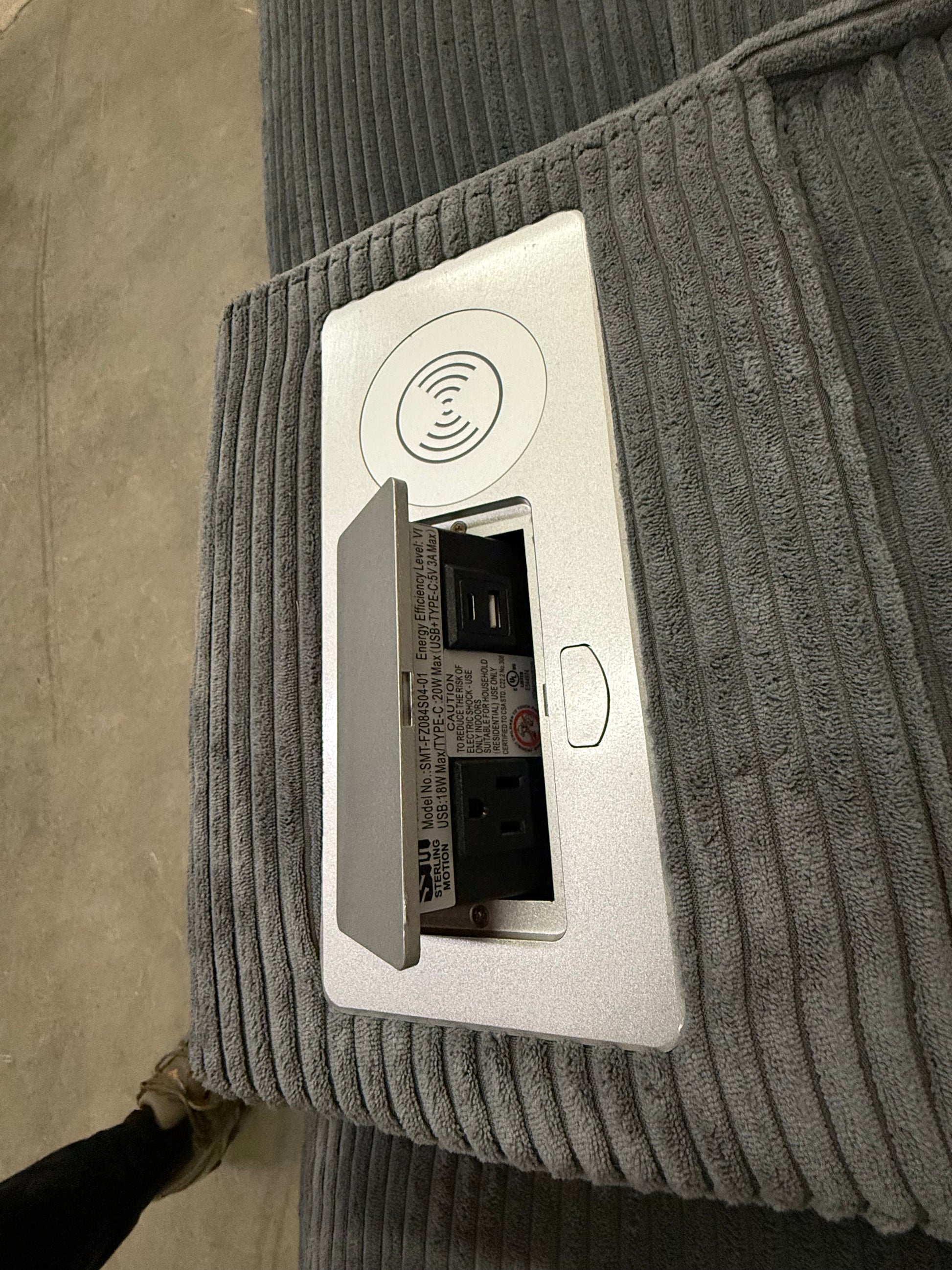 -Has bed conversion, storage, and comes in 3 pieces. In like-new condition and comes with accent pillows. The center console has a electric plug and usb charger as well as wireless phone charger and drawer. The far right seat has a recliner.