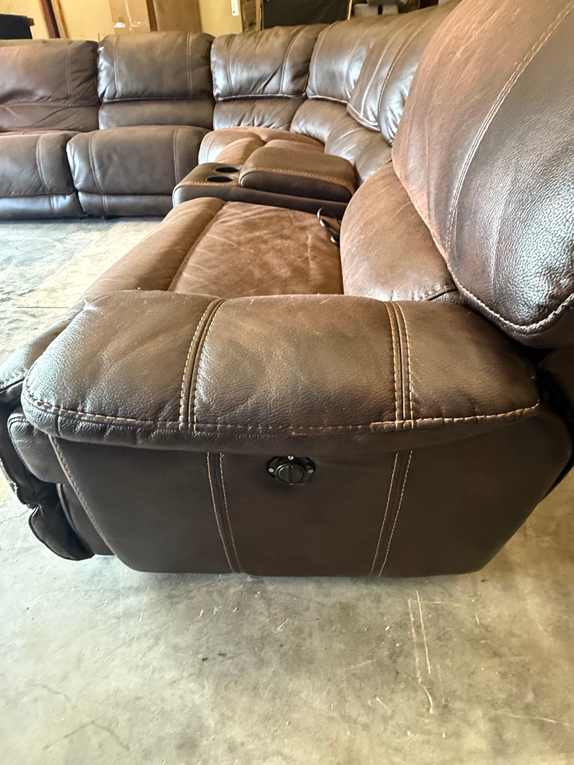 The couch is in great condition and made of real leather from a pet-friendly, smoke-free home. The brand is Raymour and Flannigan, which is a great company we don't have in Vermont, but it is common elsewhere, It measures 115x130 as shown, but it can be rearranged, as each piece is modular. It has at least two power recliners. The backs come off so it is super easy to get this couch into any doorway or up any flight of stairs. You can put the console or middle seats however you like.